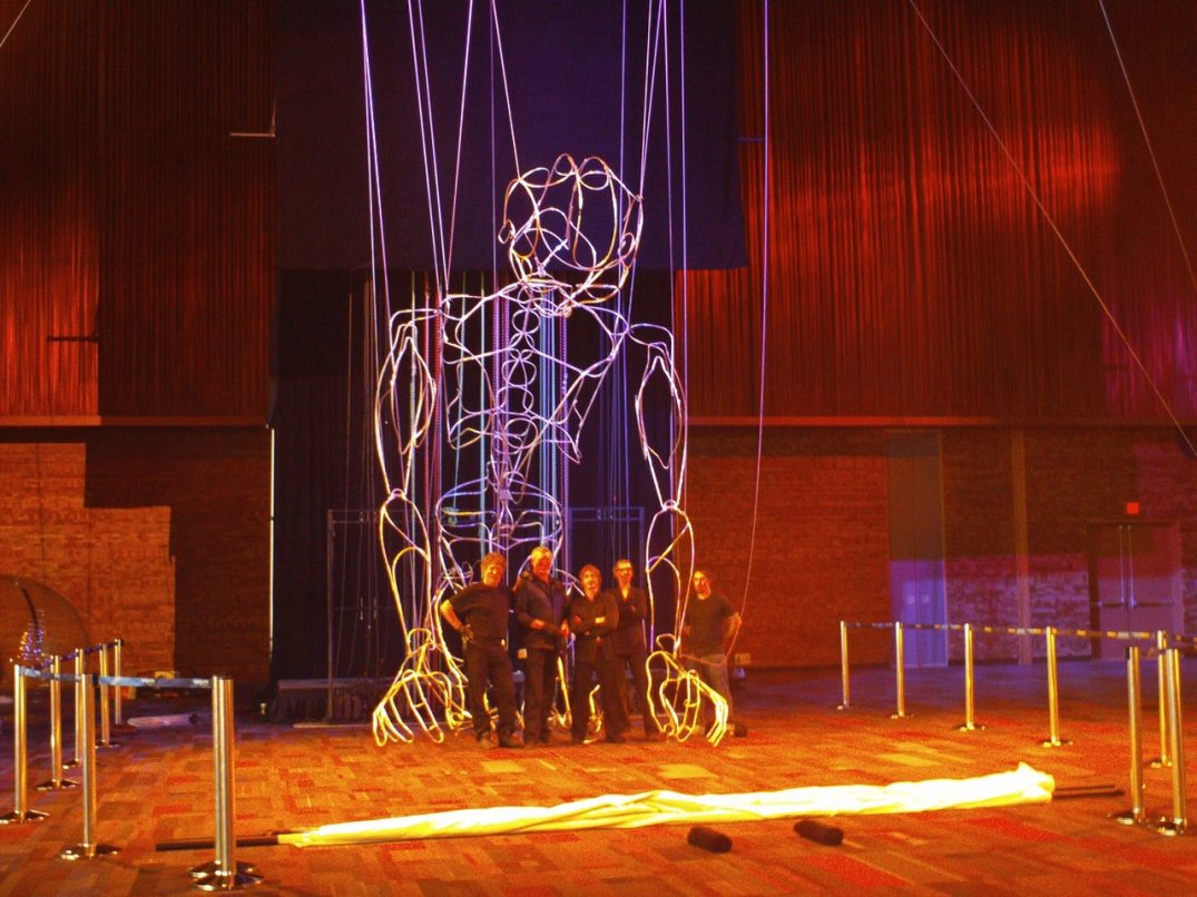 The free, outdoor event, called THE ASCENT, involves a 34-foot tall marionette, “DAVID,” climbing 39 stories of Devon Tower, assisted by a team of puppeteers and operators.
